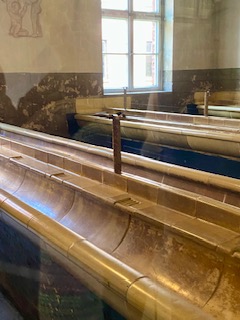We returned to Passau to walk through the town. For the first time in the past two weeks, the weather changed to heavy clouds and rain. As we walked, there were marks on the side of a building indicating how high the water was during floods and the year of the flood. It wasn’t very long ago and the level of water had to be frightening. In 2013, the water rose 12.89 meters, and in 2024, to 10.02 meters.