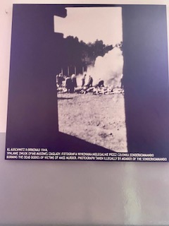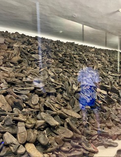 We saw the barracks, the toilets, the enclosures with the shoes, luggage, personal objects, empty cannisters that held the lethal gas, and hair shaved from those who were brought there. In the early days of the war, people were given a tatoo with their prisoner number, but toward the end of the war, when my mother and aunt arrived at Auschwitz, they didn’t even bother. Jews were required to dig the giant pits where the dead bodies were thrown. The Jews who were talented musicians had to play in an orchestra to perform for the Nazi officials. The prisoners were used in many ways to help the Nazi cause, at penalty of death, or worse.